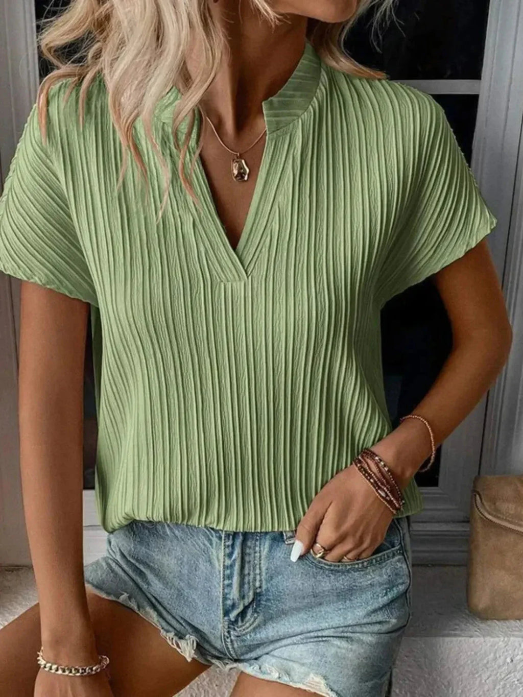 Descubra a elegância discreta da Blusa Daphne, perfeita para adicionar um toque de sofisticação casual ao seu guarda-roupa. Com um padrão sólido e ajuste solto, esta blusa de comprimento regular é ideal para ocasiões casuais e uso diário. O design de pulôver facilita vestir e combinar com outras peças do seu estilo, enquanto o decote em V e as mangas curtas conferem um visual moderno e versátil. A Blusa Daphne é a escolha certa para quem busca conforto e estilo em uma única peça, destacando sua individualidade com um toque de elegância atemporal.