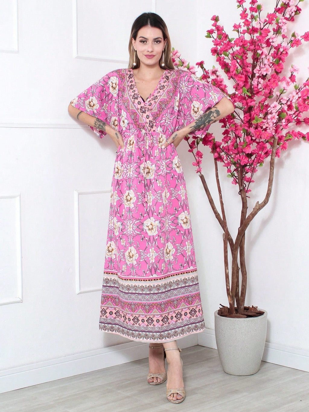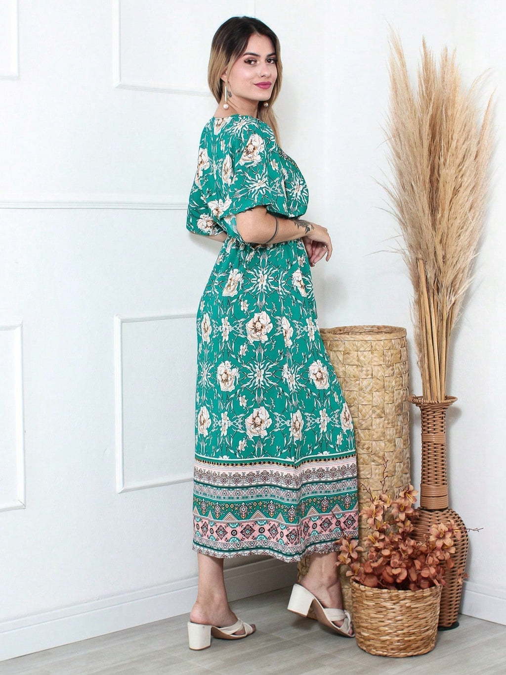 Encante-se com o charme do Vestido Brittany. Com uma estampa floral vibrante por toda a peça, este vestido traz um toque de frescor e feminilidade ao seu guarda-roupa. O detalhe do cordão adiciona um toque de sofisticação, enquanto o decote em V e as mangas curtas estilo morcego oferecem uma aparência elegante e moderna. Com seu comprimento longo e um ajuste regular, este vestido garante conforto e estilo em todas as ocasiões.