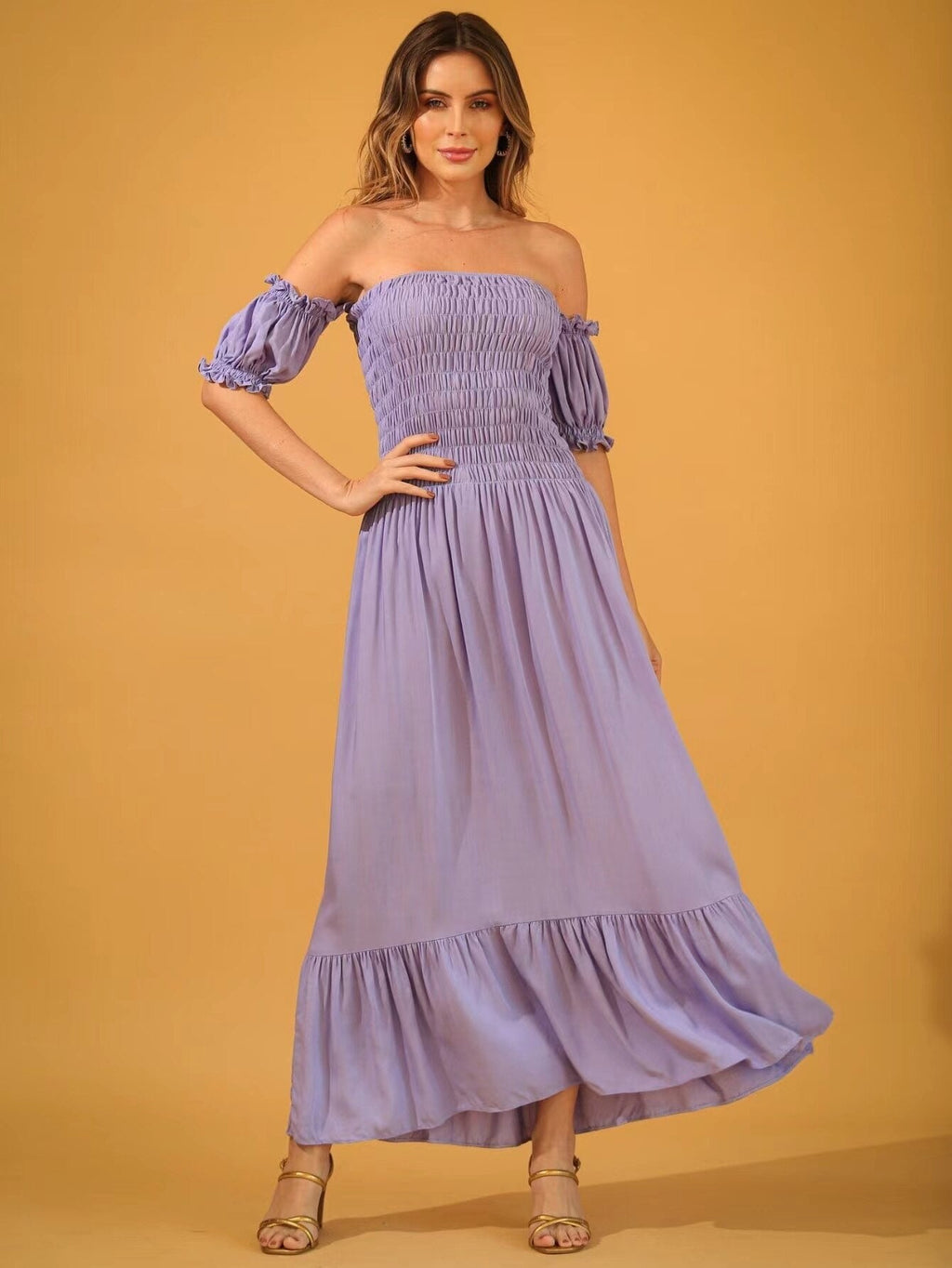 Vestido longo de viscose lisa manga longa com detalhes de lastex no punho e babados na saia. Look super leve e romântico para todas as ocasiões. Forrado na parte da saia.