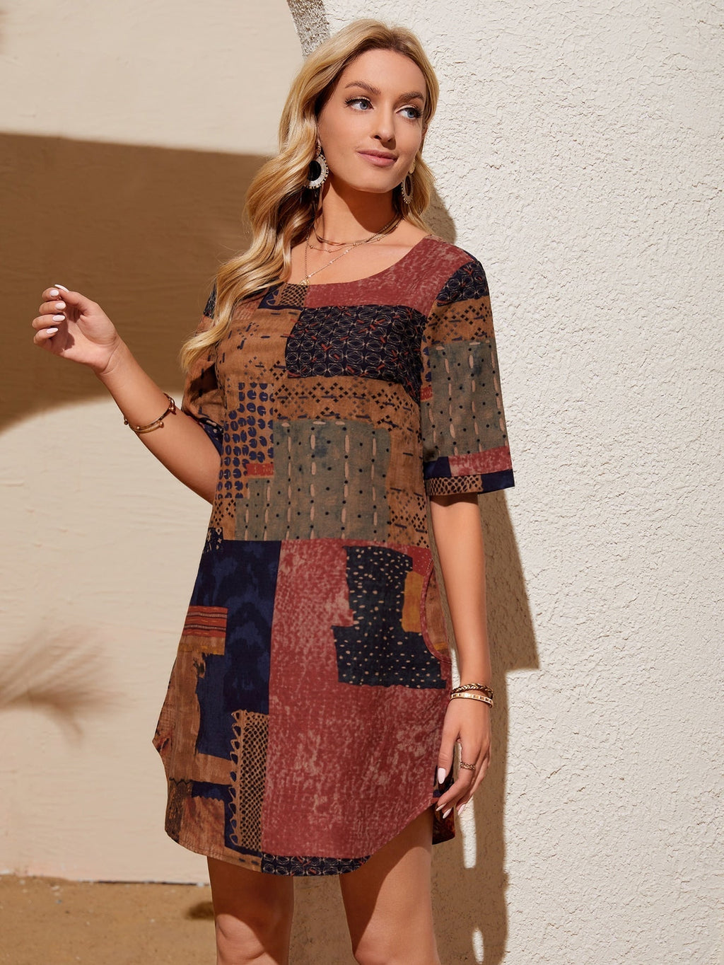 O Vestido Romana é uma expressão encantadora de estilo, com sua estampa de retalhos vibrante e design túnica. Apresentando um decote U elegante e meia manga, proporciona um equilíbrio perfeito entre sofisticação e descontração. Sua bainha assimétrica e comprimento curto adicionam um toque moderno, enquanto o ajuste regular garante conforto sem comprometer a elegância. Ideal para diversas ocasiões, este vestido é uma escolha versátil que combina charme e conforto de forma única.